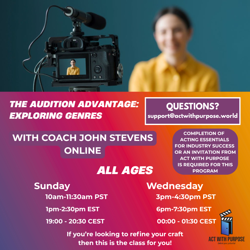 You’ll build essential skills for on-camera work and audition success. Each session includes tailored warm-ups, technique-building for hitting a mark, slating, and interview skills, plus commercial audition strategies covering wardrobe, headshots, and callbacks. We’ll also explore film terminology, the roles of agents and casting directors, commercial marketing insights, and essential casting platforms like Casting Networks, Actors Access, and Casting Workbook, with guidance on CAVCO, TAMAC, and EIC safety protocols. Weekly assignments are filmed for critique, with live, in-class feedback from John. You’ll work on SOC (silent on camera) auditions, one-liners, scripted commercials, and receive a brief intro to voiceover for commercials and animation. In the final weeks, we’ll polish your best work to present in front of a panel of industry professionals, equipping you to step confidently into the industry. Each Industry Professional will leave specific feedback about your performance so that you know how you are being perceived in the industry and can take proper steps to keeping competitive.
